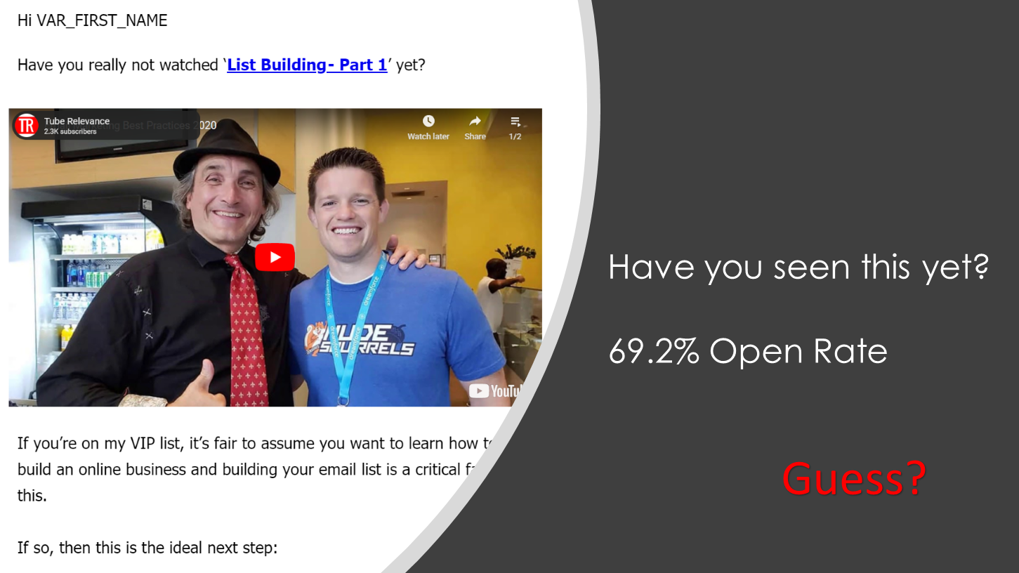The second was to pack the course with as much valuable information as I could, and RECORD IT IN FRONT OF A LIVE AUDIENCE, so you have the absolute greatest chance of duplicating my success, and teaming up with someone with ‘street smarts’ who can help you write the kinds of emails that get read. I chose the second option, because I really want you to succeed.